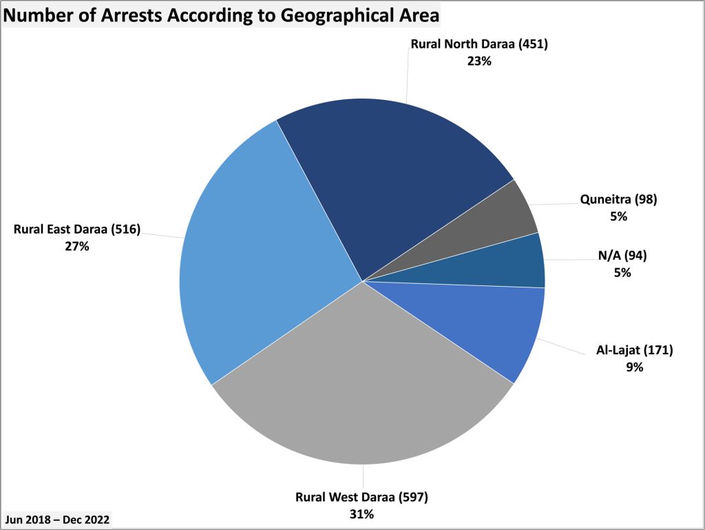 - Arbitrary Arrest Numbers: The regime arbitrarily arrested a total 1,926 people in south-west Syria since the 2018 settlement agreement, including 202 arrested in 2022. Of those 202, 83% of those arrested were either civilians, civil society or former opposition members.