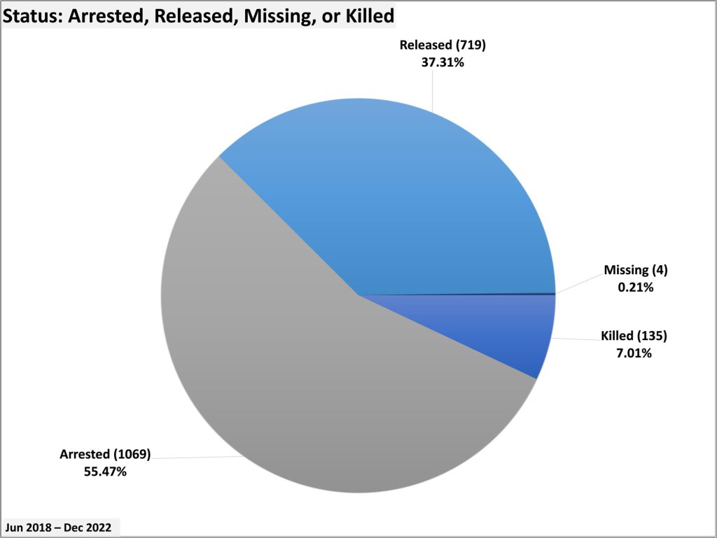 - Arrested, Released, Missing, Tortured: Of those arbitrarily arrested between 2018-2022, a majority (1,069) remain arbitrarily detained. In 2022, most detainees who were released were let out in exchange for exorbitant sums of money, reaching thousands of dollars, suggesting that the regime’s intelligence apparatus is increasingly using arbitrary arrests as an extortionary tactic in the face of deteriorating economic conditions in the country.