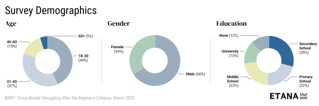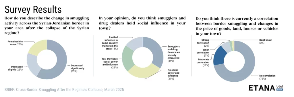 Following the collapse of the Assad regime in December 2024 in Syria, ETANA sought to better understand the views and experiences of Syrians regarding cross-border smuggling. To do so, ETANA conducted a survey of community perceptions regarding smuggling dynamics in February 2025, a few months after the Assad regime’s collapse across the province of Suwayda. The province shares a vast border area with Jordan and that has been the site of most smuggling activity of drugs and arms from Syria into Jordan in recent years.