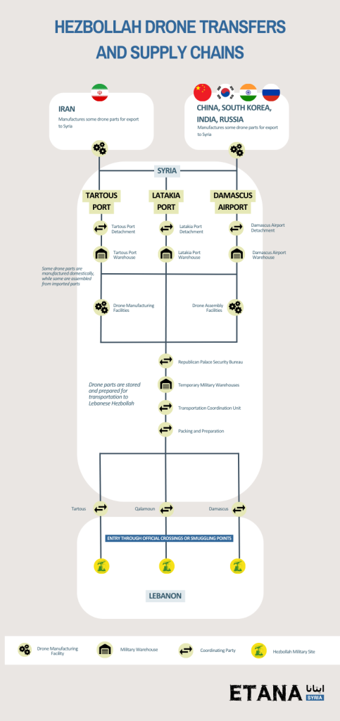 Iran’s regime has long prioritised the development of sophisticated, long-distance aerial weaponry to launch asymmetrical warfare and empower its proxies throughout the region. As far back as the 1990s, the Syrian regime sought to use this Iranian technical know-how to produce its own arsenal of UAVs and advanced missiles. After Bashar al-Assad’s ascension to power in 2000, Iran took a leading role in Syria’s Scientific Studies and Research Center (SSRC). Tasked with weapons development and staffed by numerous Iranian scientists and advisors, the SSRC became the regime’s premier laboratory for producing new weapons after the 2000s. Perhaps most widely known for its role in the regime’s chemical weapons program, the SSRC is made up of a constellation of military-industrial institutions used to develop, manufacture, test and transport advanced weaponry: Sector Four in Masyaf (Hama province) acts as an administrative bureau encompassing a wide array of laboratories and institutes focused on military technology; Institute 4000 and Branch 650 in Jamraya (Rural Damascus province) are instrumental in the development of UAV technologies; and the underground laboratories and missile bases that make up the SSRC’s Project 99 have provided the regime with a highly productive, adaptive missiles program capable of producing up to 10 sophisticated warheads each year.