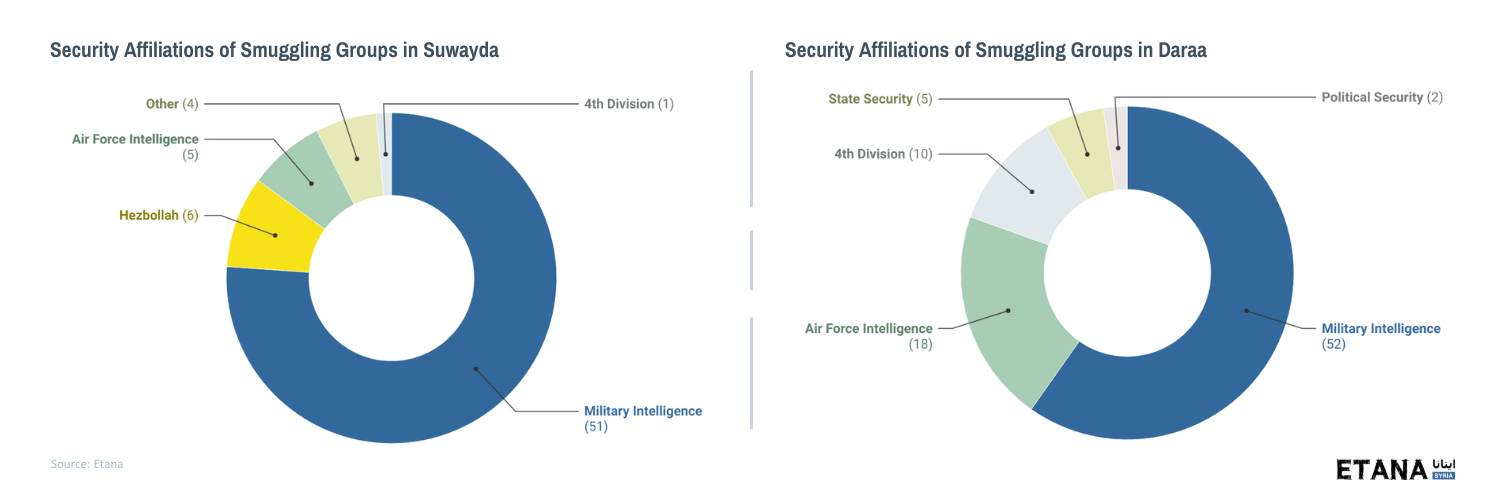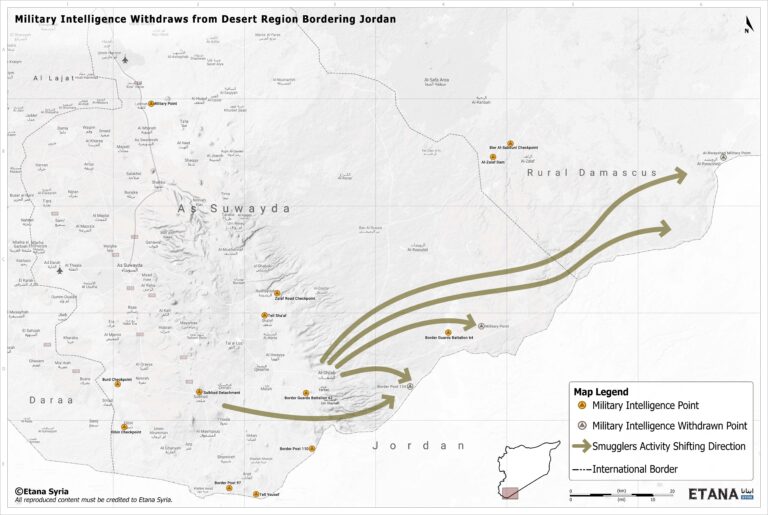 Reduction in Smuggling Infrastructure: In Daraa and Suwayda, up to 75% of previously active cross-border and internal smuggling groups folded in the wake of Ramthan’s death, either disbanding altogether or temporarily ceasing activities. Most currently inactive groups have only paused activities, meaning they can be reactivated once the situation allows.