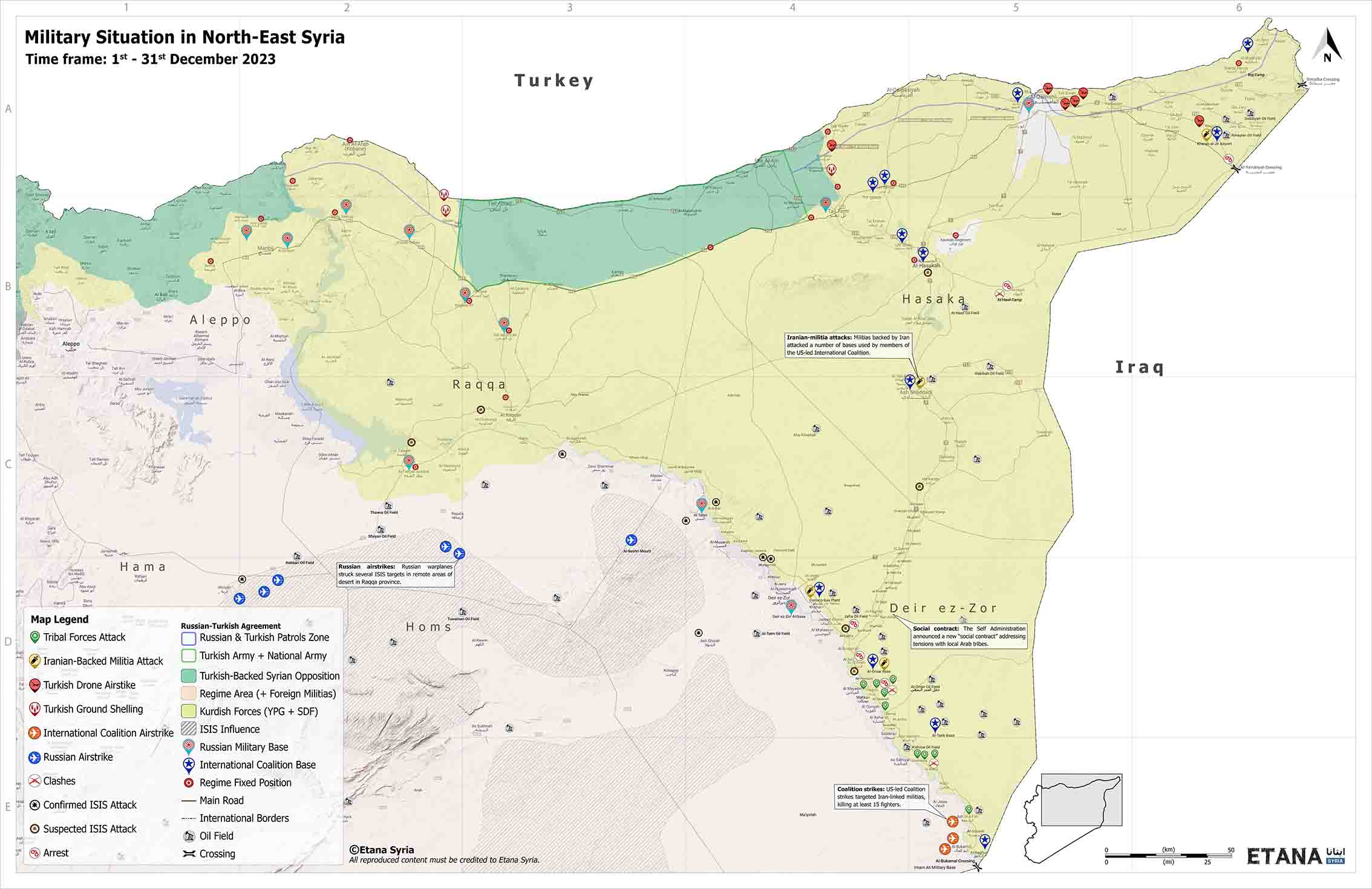 The SDF has continued to sustain attacks from Turkish forces and the Syrian National Army (SNA), with bombardments intensifying on a nearly daily basis during the second half of December. In recent weeks, drone and artillery strikes targeted SDF positions in Hasakeh and Raqqa provinces.