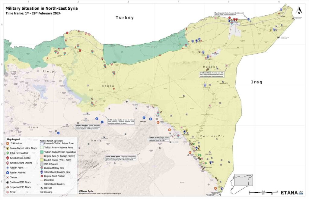 ISIS attacks against the Syrian Democratic Forces (SDF) reached a new deadly peak in February. A security vacuum left by the SDF’s months-long conflict with Arab tribes in eastern Deir Ezzor and a simmering conflict with Turkey further north has created an ideal environment for ISIS to regroup and build strength. Though ISIS-perpetrated violence was already on the rise, the SDF has only more recently become the group’s primary target in the north-east. Other areas in the region also witnessed destabilizing violence perpetrated by different armed actors in February, the traditional beginning of the truffle-hunting season when thousands of people enter dangerous stretches of remote, loosely controlled desert in search of truffles and various armed groups––including regime units, Iranian-backed militias and ISIS cells––fight over control of this highly lucrative sector. In just the first weeks of the new season, more than a dozen civilians died after stepping on a landmine while several other civilians and combatants have simply vanished, likely killed or kidnapped by armed factions operating in remote stretches of the central Badia desert.