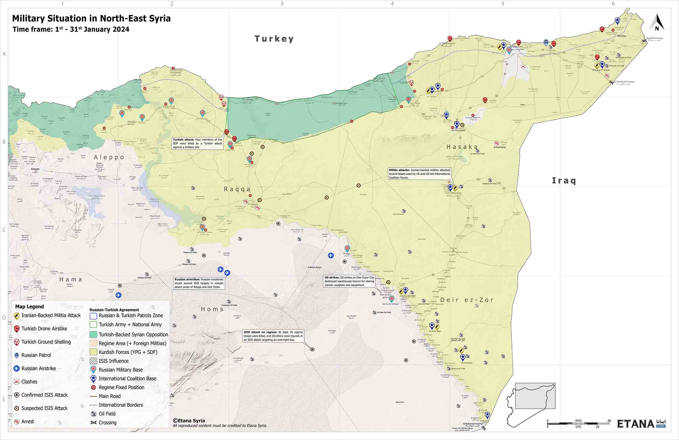 Before the 28th January attack in Jordan and the US’ subsequent wave of retaliatory strikes in Syria and Iraq, the US-led Coalition conducted a series of smaller-scale retaliations across January in response to continued Iranian-backed militia activity. On the Iranian side, various militias launched an all-time monthly high of at least 18 offensive operations against US and US-led International Coalition personnel and infrastructure in Deir Ezzor and Hasakeh.