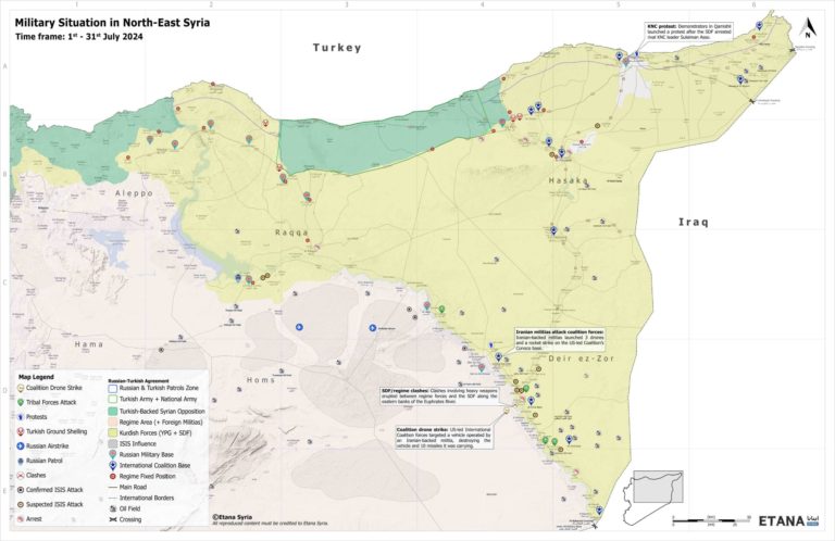 Low-intensity clashes between the SDF and tribal forces continued across Deir Ezzor province in July. Between 19th and 20th July, dissident tribal fighters attacking several checkpoints and military sites in a series of small-scale attacks in western Deir Ezzor. Days later, another attack targeted an SDF military headquarters in eastern Deir Ezzor’s Abu Hamam. Meanwhile, the SDF still regularly clashed with regime forces in eastern Deir Ezzor province—despite cooperation with Assad’s forces in areas bordering Turkish-controlled territory.
