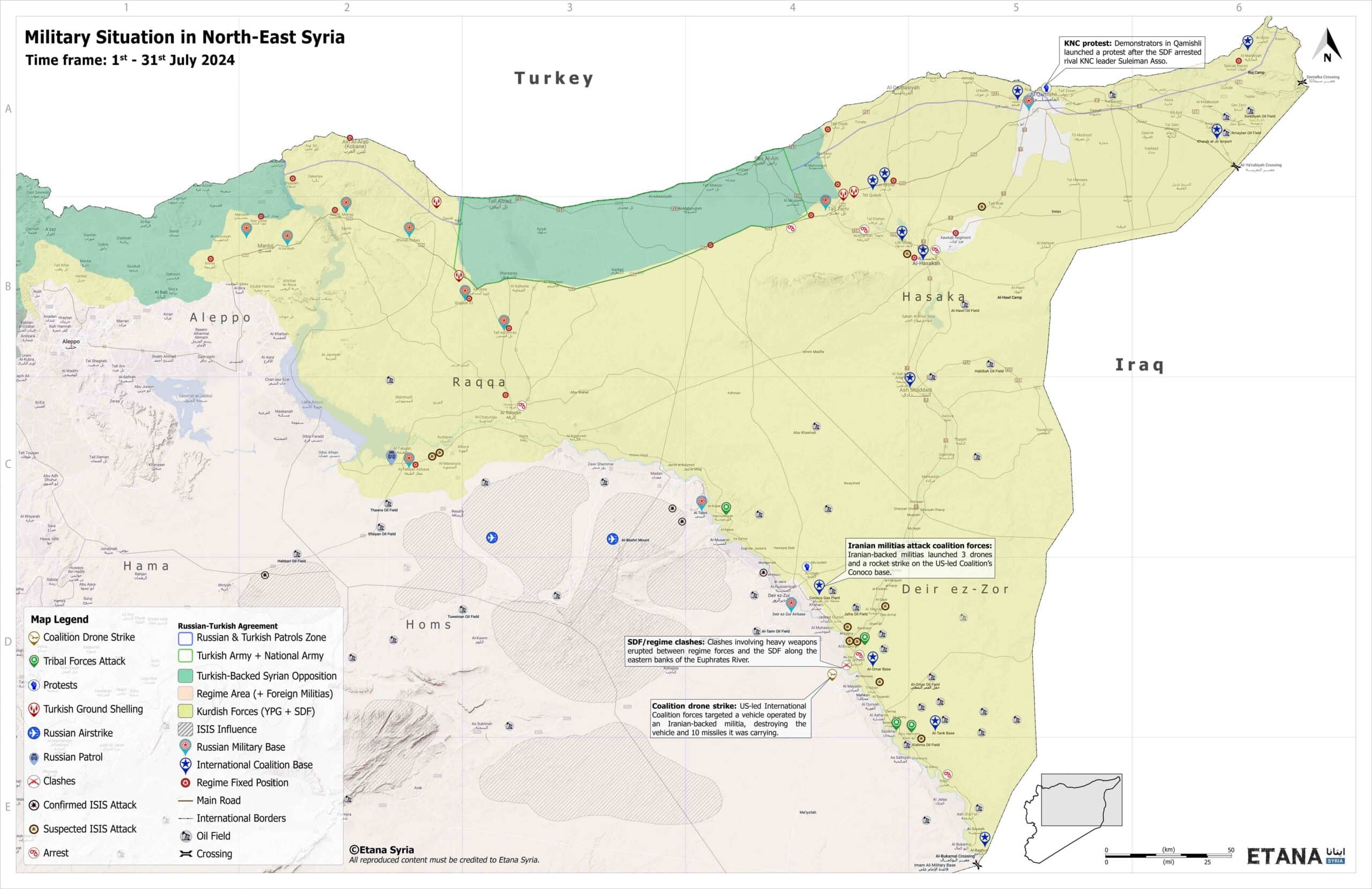 Clashes between the SDF and Turkish forces slowed in recent weeks, with the number of cross-border altercations tapering off to the lowest point in months. Even so, Turkish military forces bombarded SDF positions with heavy weaponry early in July, striking rural areas of northern Hasakeh. No casualties were recorded.