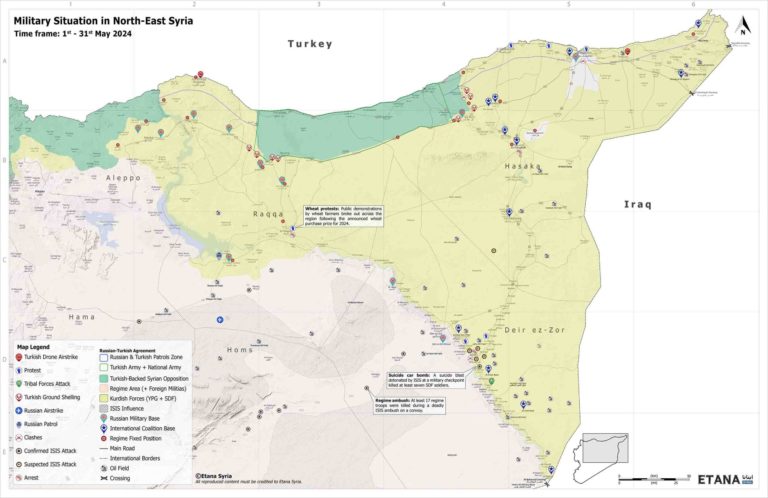 An outbreak of protests by local farmers erupted across Self Administration-controlled areas of north-east Syria, following the decision by authorities to set the purchase price for wheat at 31 cents per kilo for the 2024 season—a decision certain to incur significant financial losses for producers in the coming months. Due to the centrality of agriculture to the local economy in Deir Ezzor and Hasakeh, the current demonstrations have spread quickly.