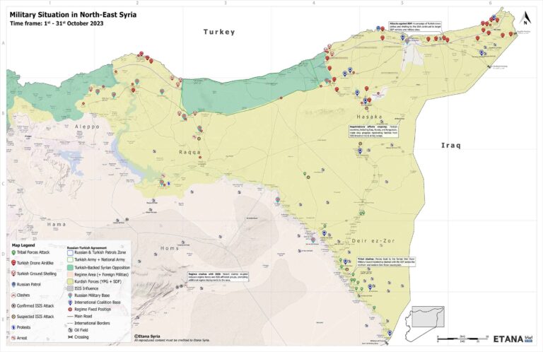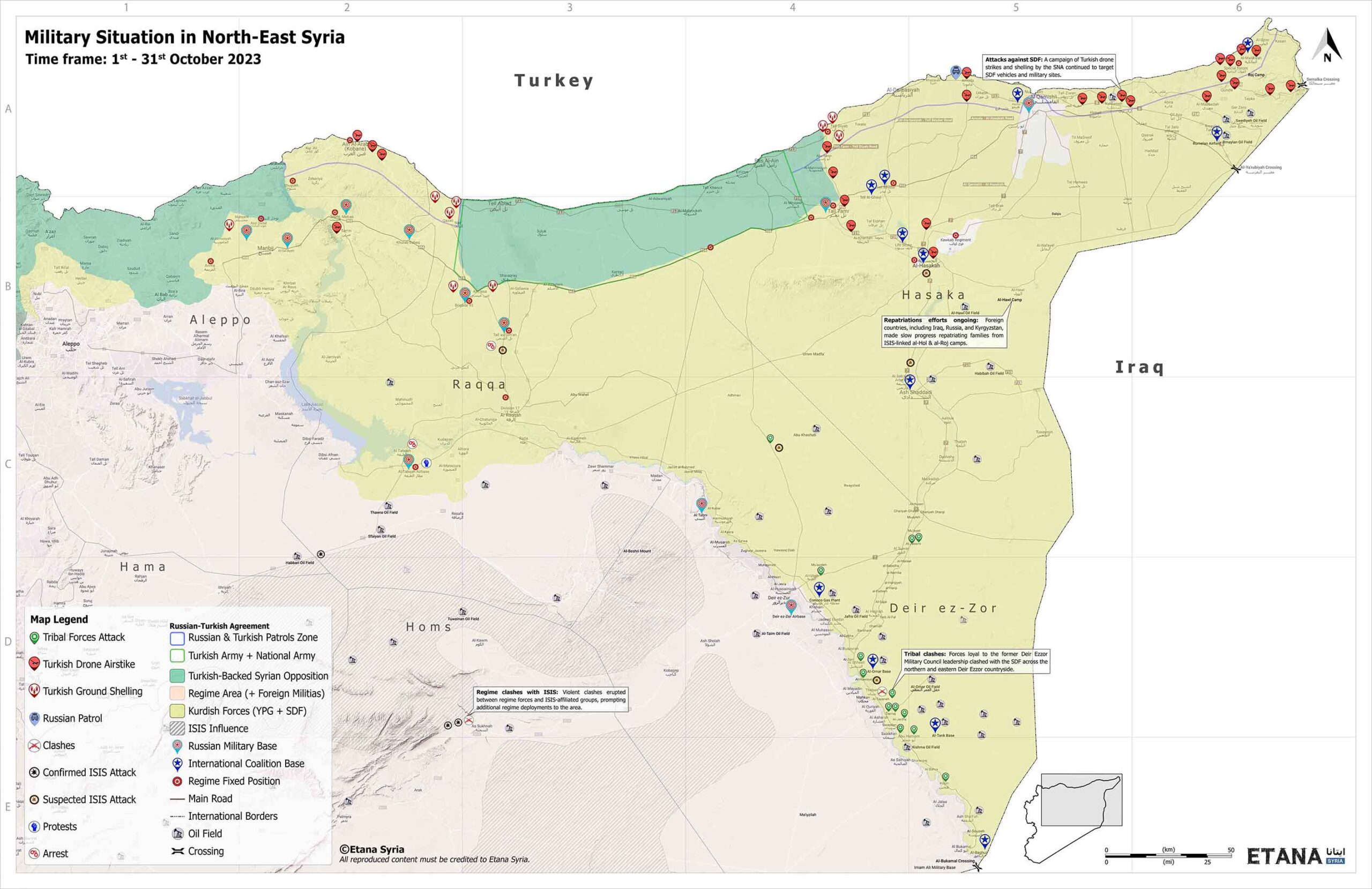 Following a suicide attack targeting the Turkish Interior Ministry in Ankara in early October, Turkish forces and the Syrian National Army (SNA) ramped up a campaign of drone strikes and shelling against SDF sites across north-east Syria. Most of these attacks were concentrated in the northern border region of Hasakeh province. Turkish forces targeted SDF military sites, as well as several power stations and oil wells, in parts of northeastern Hasakeh.