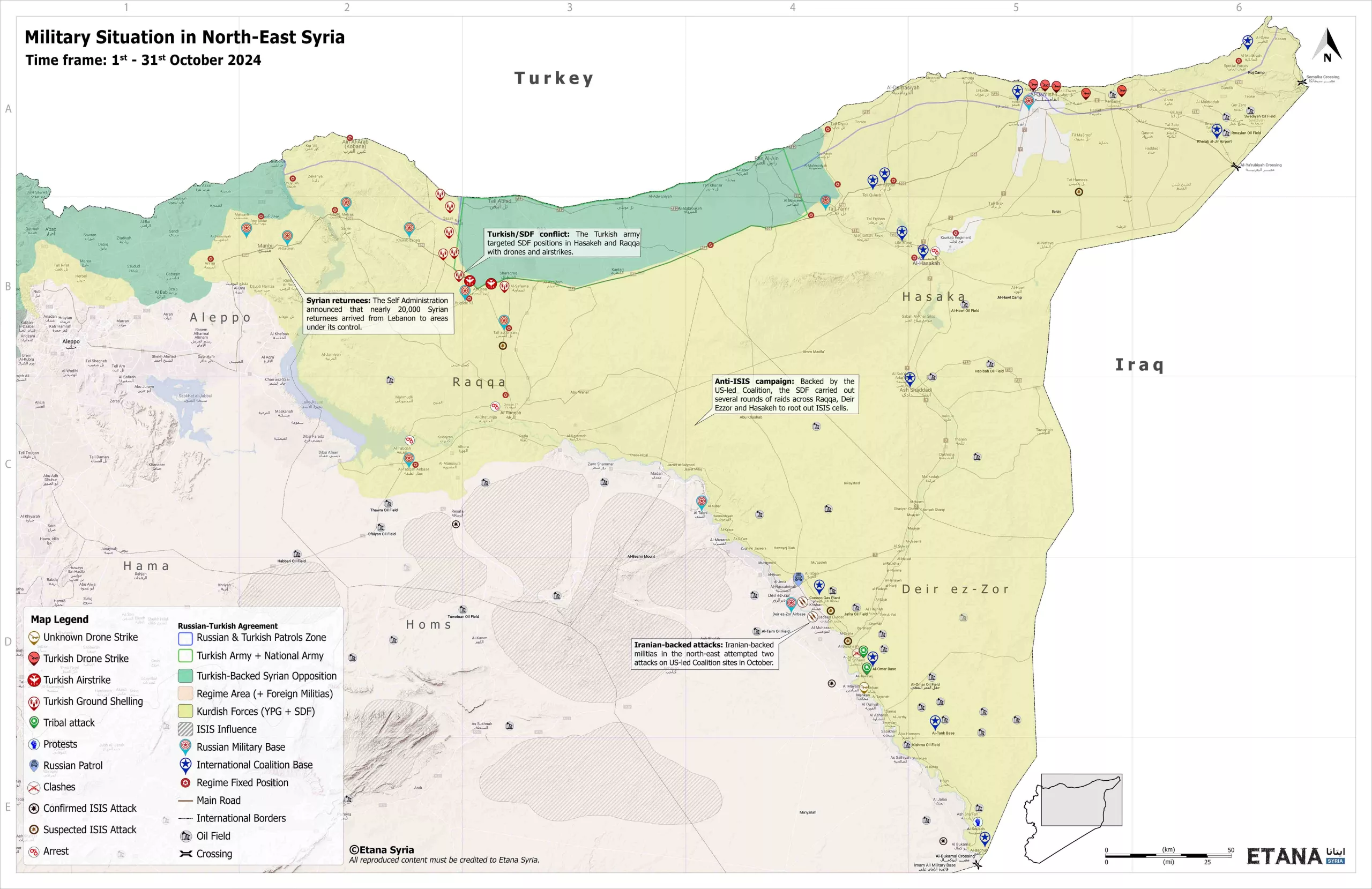 Later in the month, a major attack by the Kurdistan Workers’ Party (PKK) on the Turkish Aerospace Industries (TUSAŞ) facility near Ankara, saw Kurdish fighters detonate explosives and open fire on the facility, killing five people and injuring 22 others. In response, Türkiye initiated a wave of suicide drone attacks and airstrikes against PKK-linked and Syrian Democratic Forces (SDF) sites in north-east Syria, striking urban and rural sites across Raqqa and Hasakeh provinces.