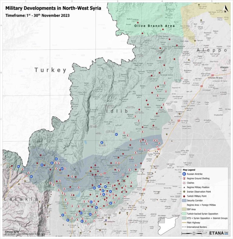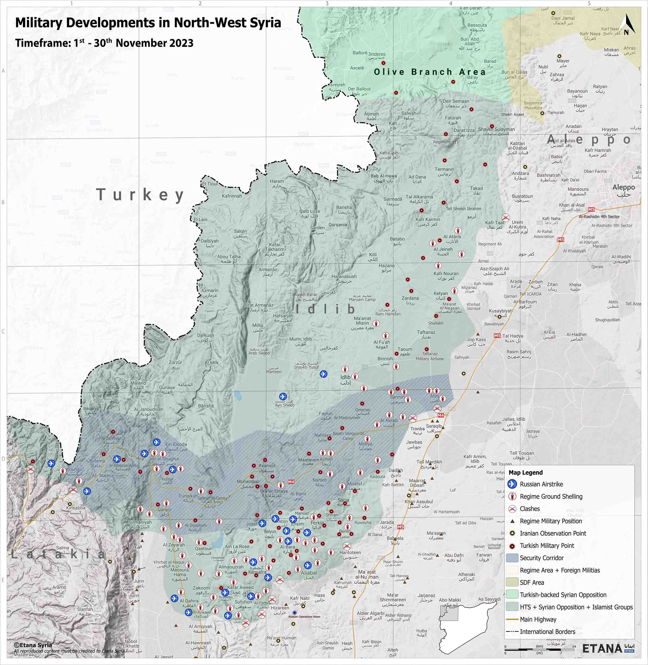 In coordination with the regime, Russian warplanes also continued an uptick in airstrikes from recent weeks, with dozens of attacks against civilian and military targets confirmed in the first half of November. Strikes were recorded across the provinces of Idlib, Hama and Latakia.