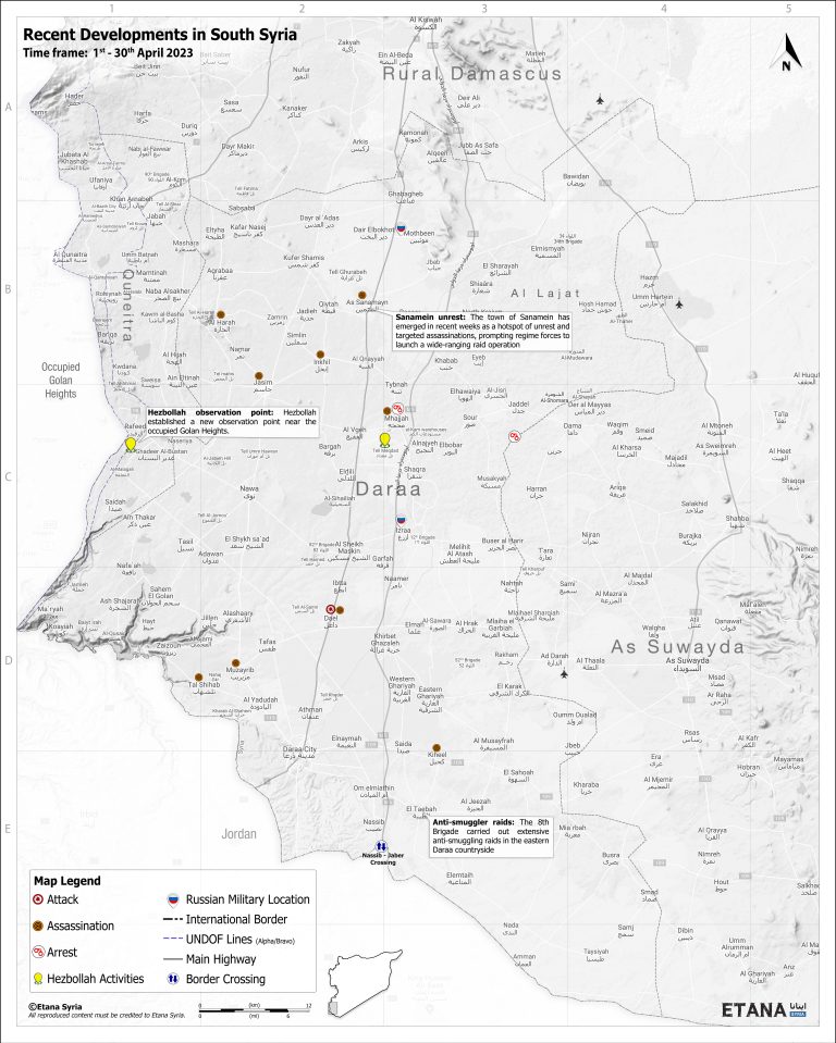 Regime forces and civilians were targeted in a wave of deadly attacks in April, and the town of As Sanamayn has emerged as a particular hotspot of unrest and targeted assassinations. Over 19 assassinations were successfully carried out in the southwest, targeting figures that included regime soldiers, former opposition leaders, drug traffickers, and displaced civilians. Dozens of other attempts were also recorded. Additionally, an armed group attacked an Air Intelligence checkpoint with RPG shells, injuring 2 soldiers. Another armed group attacked Military Intelligence unit Branch 220 with medium weapons, killing the unit’s first assistant and injuring several others.