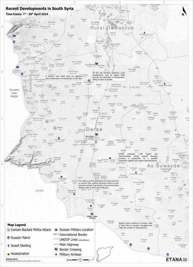 In late April, regime and Iranian-backed militias started sending a concerning number of military reinforcements to Suwayda province. ETANA assesses that, by 30th April, around 1,200 regime troops and militia fighters were sent to Suwayda. Notably, these included members of the regime’s Republican Guard, Air Force Intelligence and Military Intelligence. These are unusual deployments suggesting that the regime did—or does still—plan some form of violent crackdown in Suwayda. Notably, Iran’s Islamic Revolutionary Guard Corps (IRGC) and Quds Force fighters were also part of the deployments.
