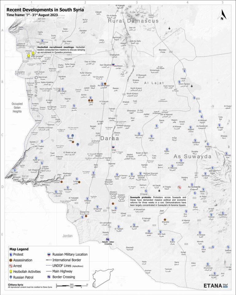 Daraa has witnessed persistent public demonstrations against the regime and deteriorating living conditions for several weeks now. These protests have taken place on an almost daily basis, attracting thousands of participants in numerous locations across the province since 20th August. While protest numbers appear to have plateaued for the moment, they have not diminished in size or scope despite strenuous efforts by regime officials to undermine the popular movement. Regime-offered incentives have included back-channel entreaties to local armed factions as well as offers to issue more passports to residents of protesting regions, but also threats to reverse recently completed reconciliation process by re-issuing arrest warrants for reconciled individuals.