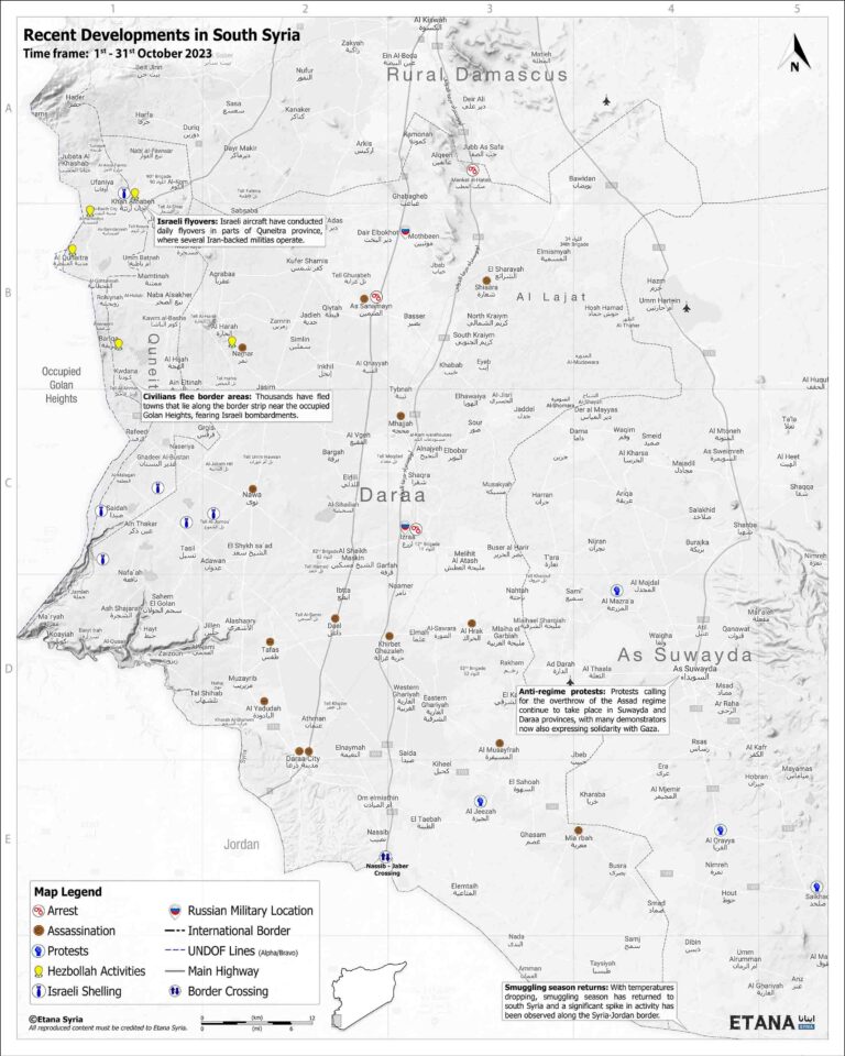 Cross-border hostilities have continued to intensify in southern Syria, with the border strip between Quneitra and the Israeli-occupied Golan Heights experiencing regular instances of tit-for-tat violence between Israeli forces and Iranian-backed militias. Amid the hostilities, Hezbollah has redeployed fighters to several positions in Daraa and Quneitra. In response to repeated attacks by Iranian-backed militias, Israeli forces launched retaliatory strikes against sites in the Yarmouk Basin as well as Damascus International Airport between 19th and 25th October. Israeli forces have started preventing anyone from approaching the border strip between the occupied Golan Heights and Syrian territory. Additionally, Israeli reconnaissance aircraft have conducted intensive daily flyovers in parts of Quneitra province while dozens of Israeli tanks have been deployed along the border strip with the Golan.