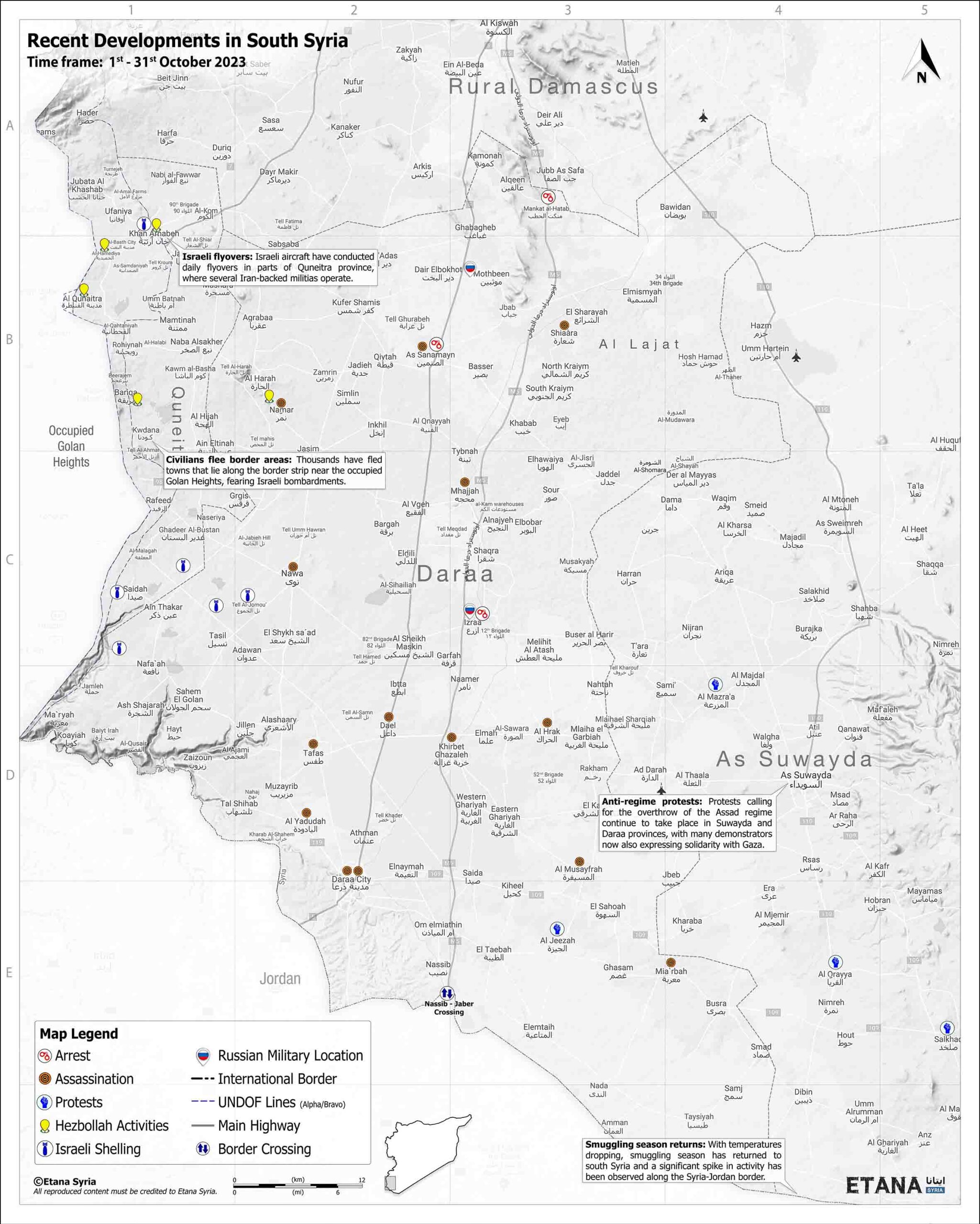 Nearly 5,000 people fled towns along the border strip near the occupied Golan Heights in anticipation of Israeli bombardments. Meanwhile, at least 85 young people from Daraa and Quneitra arrived in Italy in the first half of October, with more than 3,000 others from the region reportedly waiting to make the trip from Libya. Groups of people from south-west Syria are still arriving to European countries on an almost daily basis.