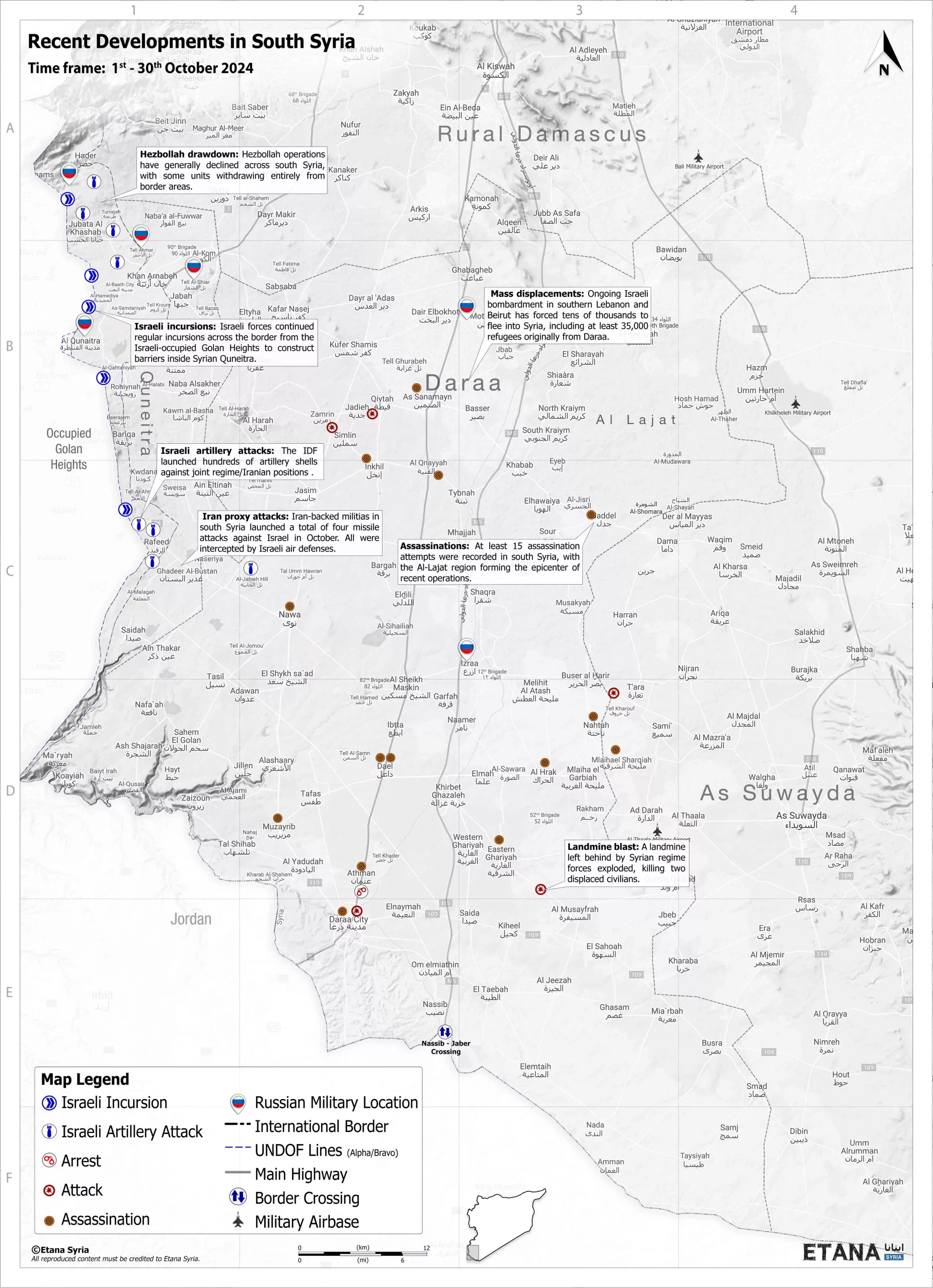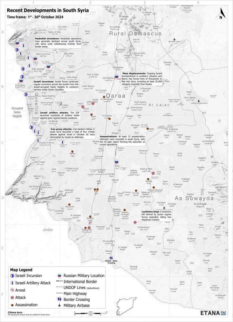 ETANA has also documented similar incursions into Quneitra province, noting that in September, Israeli forces were seen constructing new observation posts between Quneitra and the occupied Golan. In response to increased Israeli activity in the area, Syrian regime forces in south Syria were placed on the highest level of combat readiness amid the rapid escalation in Lebanon.