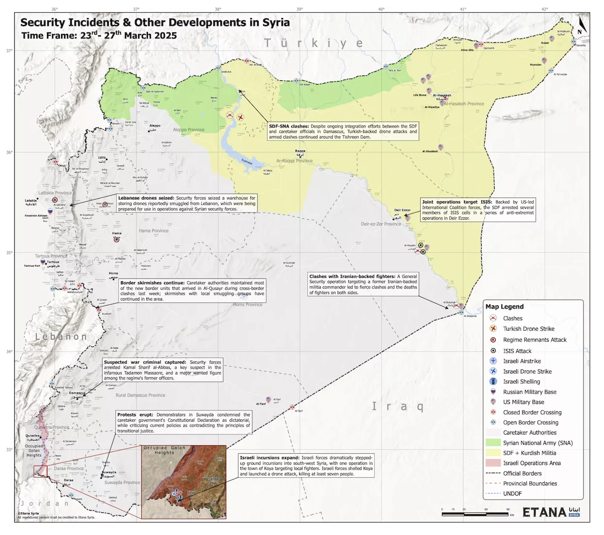 Following months of daily ground incursions into south Syria, Israeli forces escalated tensions on 25th March with a significant operation targeting armed groups in the Yarmouk Basin town of Koya in south-west Daraa. During the operation, a 60-member Israeli patrol advanced from south-west Daraa, reaching the outskirts of Koya, which is approximately 4km from the border strip. Israeli forces fired tank shells towards Koya’s outskirts prior to actually entering the town. A group of local fighters, who had taken positions in a valley inside Koya, attempted to ambush the convoy, leading to armed clashes and a further round of Israeli artillery bombardments. An Israeli drone strike subsequently targeted a gathering of fighters to the west of Koya, killing several individuals. While some previous Israeli convoys have encountered ambushes inside Syrian territory, this week’s attack represents the most serious armed resistance to challenge an Israeli incursion since the fall of the Assad regime.