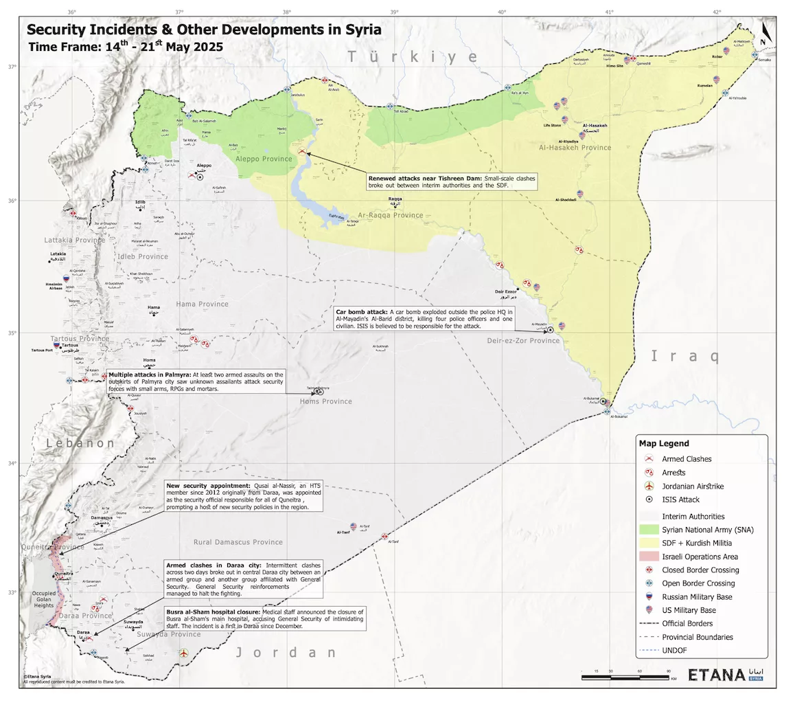 ISIS has consistently attacked SDF targets in Syria’s north-east, but only earlier this month claimed their first attack on interim authorities. On 5th May, cells killed two General Security fighters at a checkpoint in eastern Deir Ezzor, possibly in response to an increase in anti-ISIS operations by interim authorities. Since then, ETANA has recorded at least two separate attacks in and around Palmyra city, believed to be linked to ISIS, which saw unknown militants attack security forces with small arms, RPGs and mortars in late May. In the same week, an unidentified group attacked a house and two vehicles near the courthouse on the eastern outskirts of Palmyra before fleeing the area, the second attack of its kind in the same district in as many days. Additional security checkpoints have been set up in response.