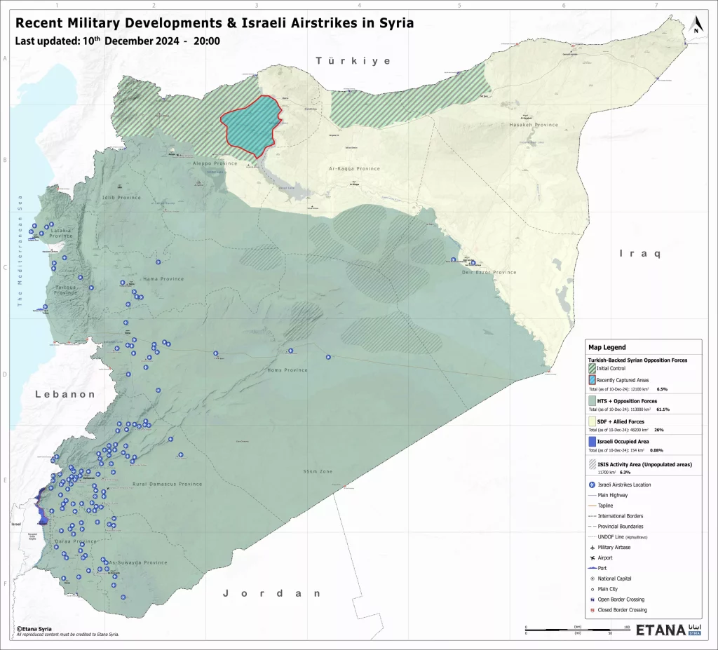 While work begins to build a post-Assad government in Damascus, fighting is continuing further east between the Turkish-backed Syrian National Army’s Fajr al-Hurriyeh (Dawn of Freedom) operations room and the Syrian Democratic Forces (SDF). The SDF has lost control of Manbij, and there are concerns about further military developments in Raqqa province. Concurrent advances by Operation Deterring Aggression factions into western Deir Ezzor have prompted clashes with the SDF and warnings from the US-led International Coalition for advancing factions to avoid the Euphrates frontline.